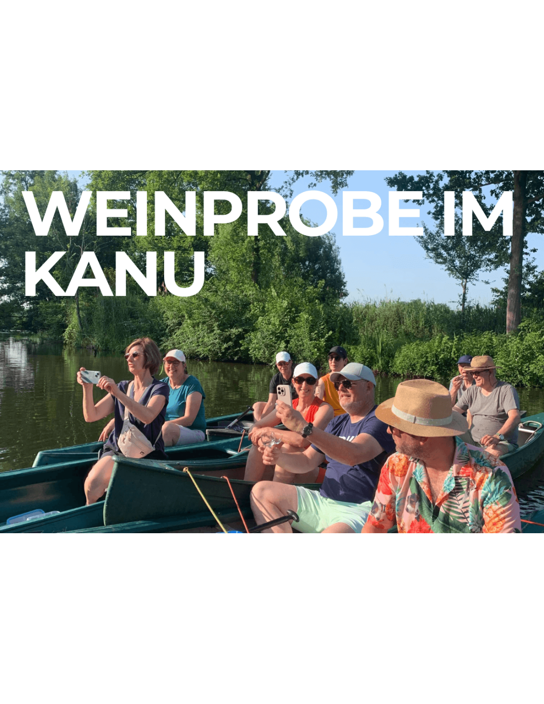 6-8 Weine – i.d.R. Weißwein, Rosé, Rotwein - werden bei der Weinprobe vorgestellt (für Teilnehmer, die keinen Wein trinken, halten wir auf vorherige Anfrage hin einen hochwertigen Traubensecco bereit). Informationen zu Weinen, Hintergründen und auch Ungewöhnliches wird den Teilnehmern auf eine lockere Weise vermittelt. Dabei fahren die Teilnehmer in den Kanus durch die wunderschöne Münsterländer Parklandschaft. Zu Beginn erhalten Sie eine kurze Einführung, worauf es beim Kanufahren zu achten gilt.